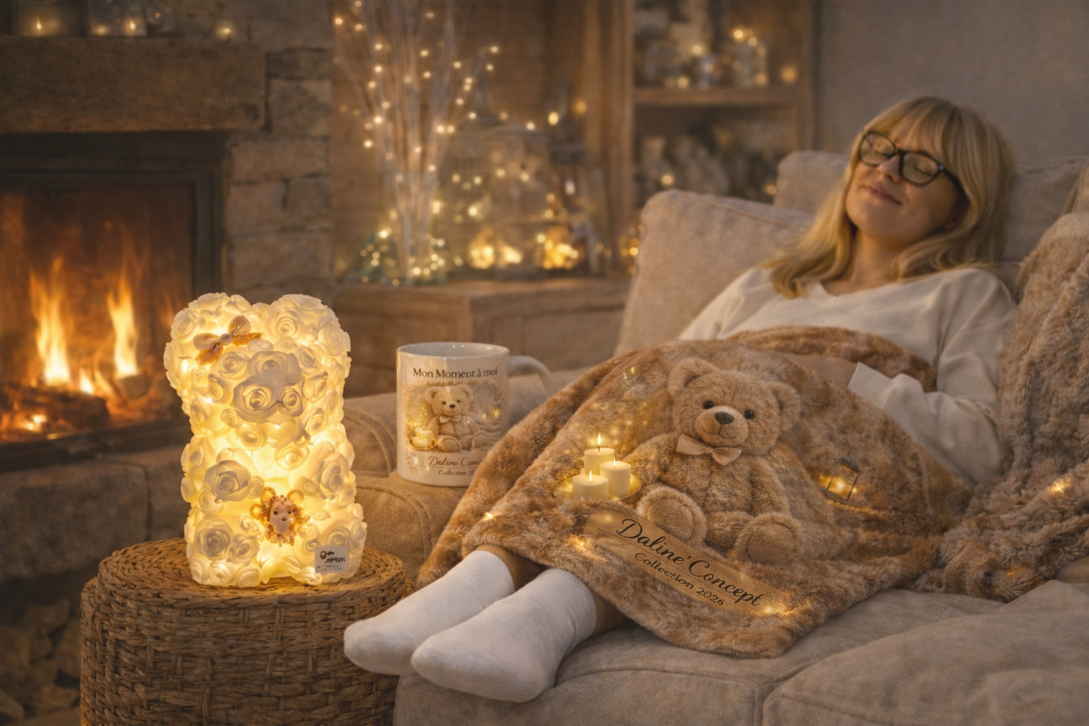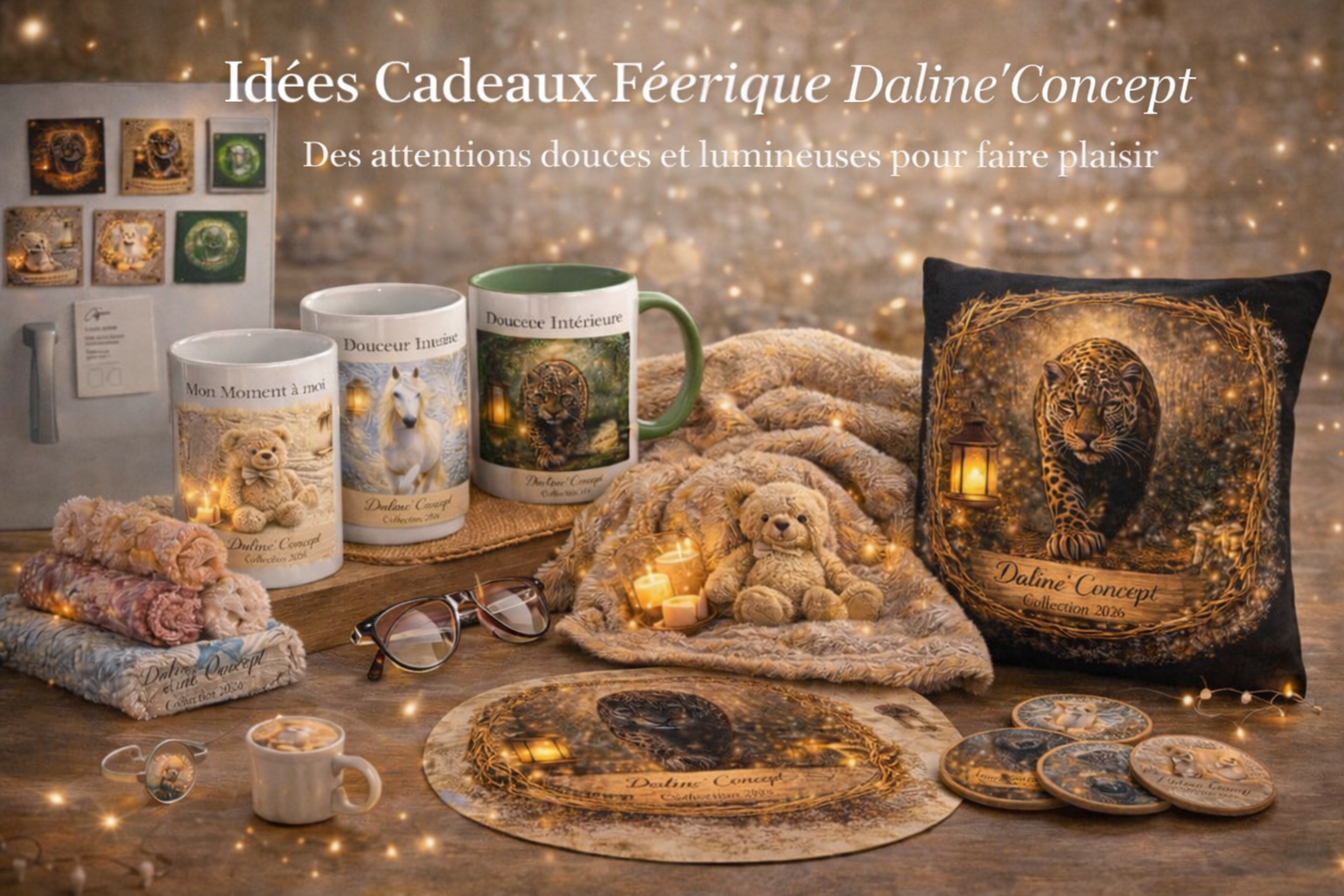 Chaque pièce est illustrée dans l’univers féerique Daline’Concept, mêlant lumière dorée, nature enchantée et tendresse, pour transformer les objets du quotidien en petits trésors.